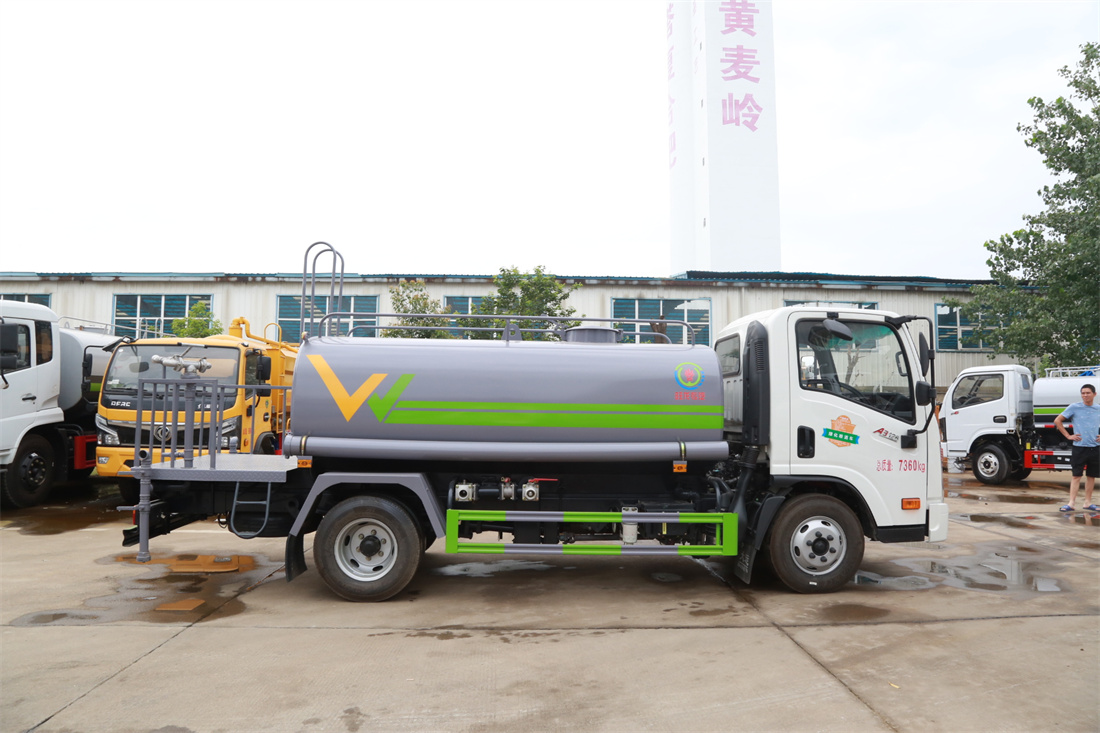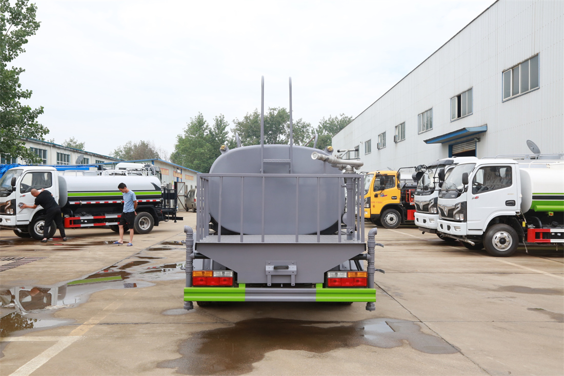 灑水車前裝有鴨形噴嘴或圓頭沖嘴,后面裝有圓柱開(kāi)灑水噴嘴或蓮蓬頭噴嘴,后部有一工作平臺(tái),裝配有水炮。后部還可裝8個(gè)噴嘴(選裝)。