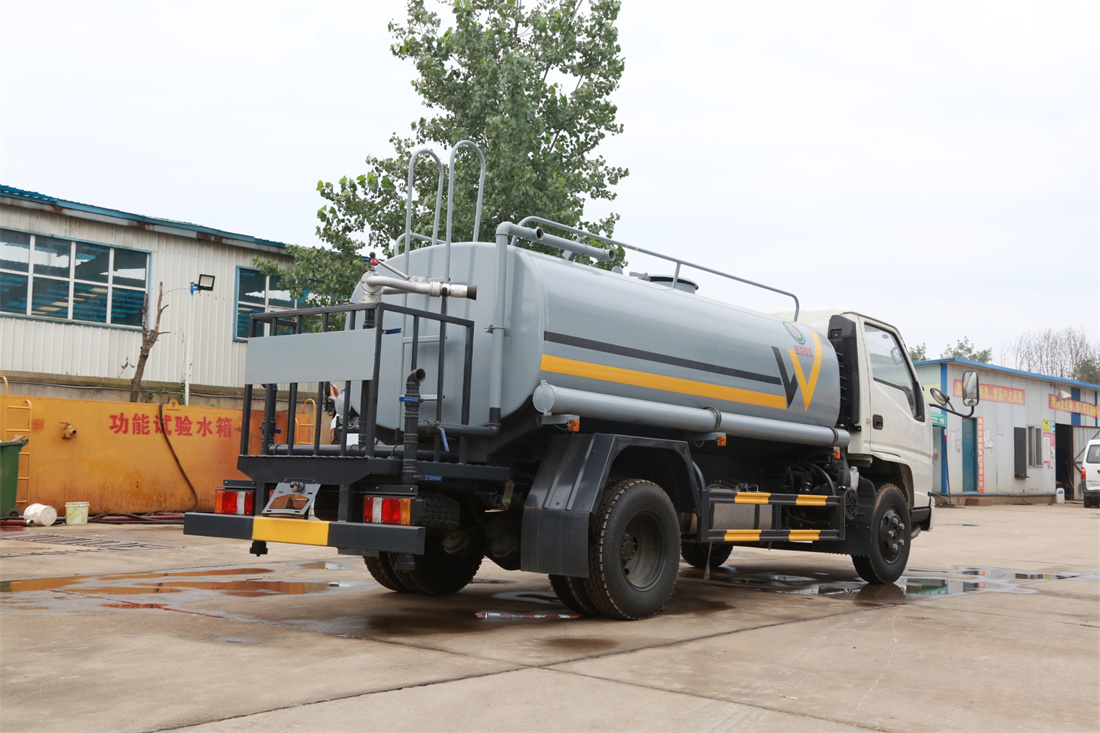 灑水車前裝有鴨形噴嘴或圓頭沖嘴,后面裝有圓柱開灑水噴嘴或蓮蓬頭噴嘴,后部有一工作平臺,裝配有水炮。后部還可裝8個噴嘴(選裝)。