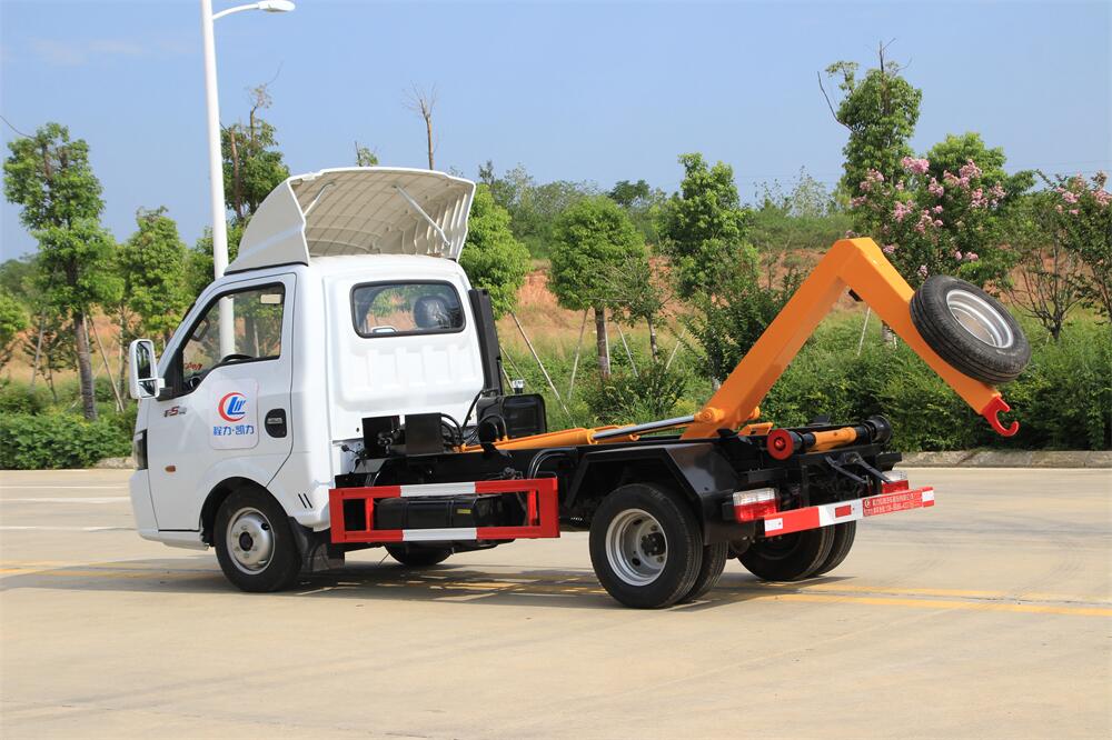 該款鉤臂式垃圾車由液壓系統、操作系統組成。舉升油制缸(1支)系國內知名液壓件廠家生產的雙作用油缸。垃圾廂可自吊上放下,可自行傾倒垃圾,上下一次工作循環時間≤50S。該車的特點是一個車能配多個垃圾廂,能實現一臺車與多個垃圾廂聯合作業,循環運輸,充分提高了車輛的運輸能力。