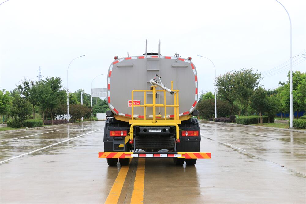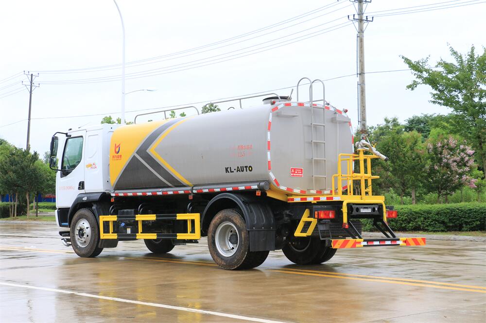 灑水車前裝有鴨形噴嘴或圓頭沖嘴,后面裝有圓柱開灑水噴嘴或蓮蓬頭噴嘴,后部有一工作平臺(tái),裝配有水炮。后部還可裝8個(gè)噴嘴(選裝)。