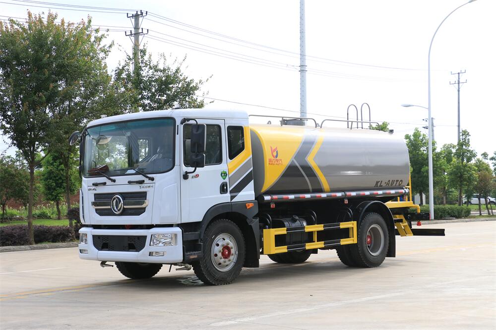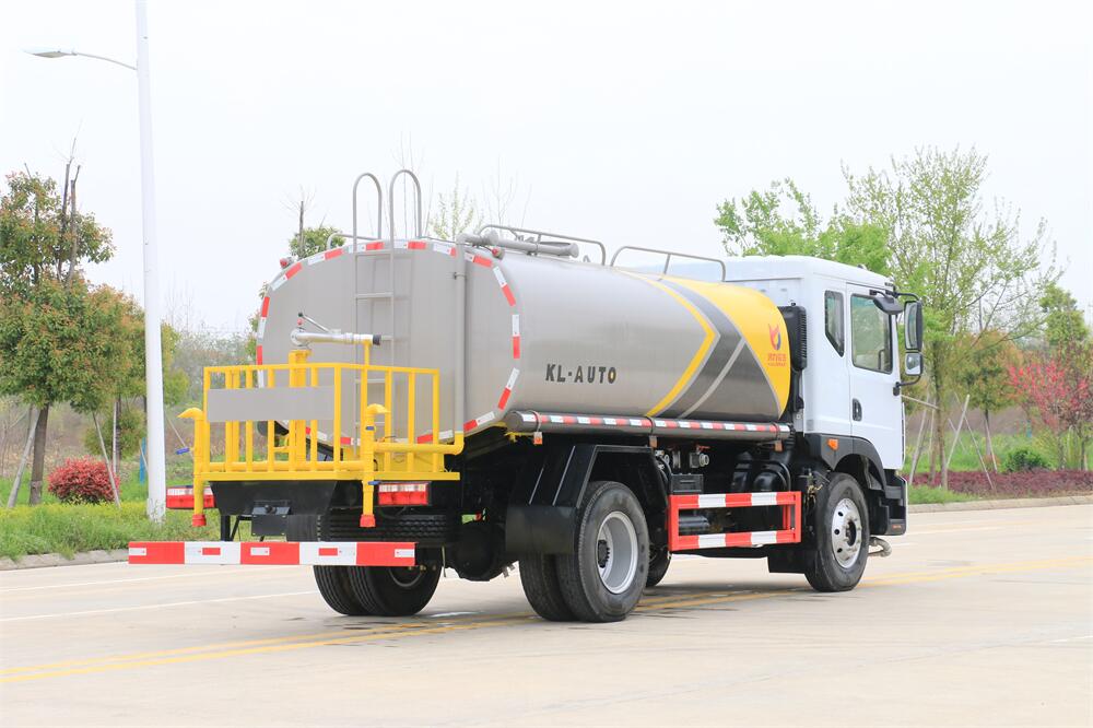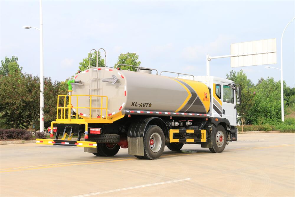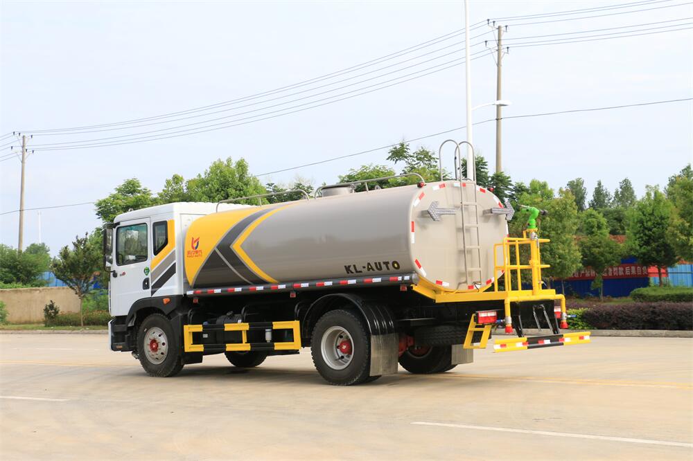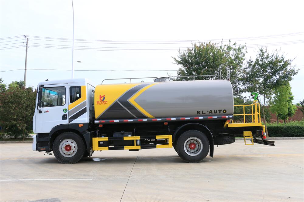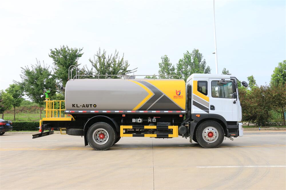 灑水車前裝有鴨形噴嘴或圓頭沖嘴,后面裝有圓柱開灑水噴嘴或蓮蓬頭噴嘴,后部有一工作平臺(tái),裝配有水炮。后部還可裝8個(gè)噴嘴(選裝)。