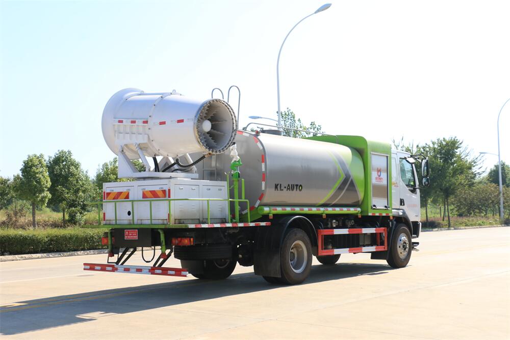 上裝配置:罐體容積為 12立方,選配風送式霧炮機組射程30米、40米、50米、60米、80米、100米、120米霧炮,罐體鋼板為4mm碳鋼Q235材質,罐內隔板具有防波作用,以減輕汽車行駛時罐體液體沖擊,罐體及整車外形尺寸按照公告。帶大功率專用灑水泵,泵可自吸自排,整車前沖、后灑、側噴、帶65消防接口,后平臺配CLW-50、CLW-60、CLW-80、CLW-100、CLW-120型風送式霧炮機組;罐體前封頭配大功率柴油發電機組;前封頭帶水位計,后平臺主管路帶1寸澆花接口,后爬梯。帶兩根輸水管及陰陽端。罐體顏色:銀/灰/綠,罐體兩側噴“多功能抑塵車”字樣,貼反光標示。