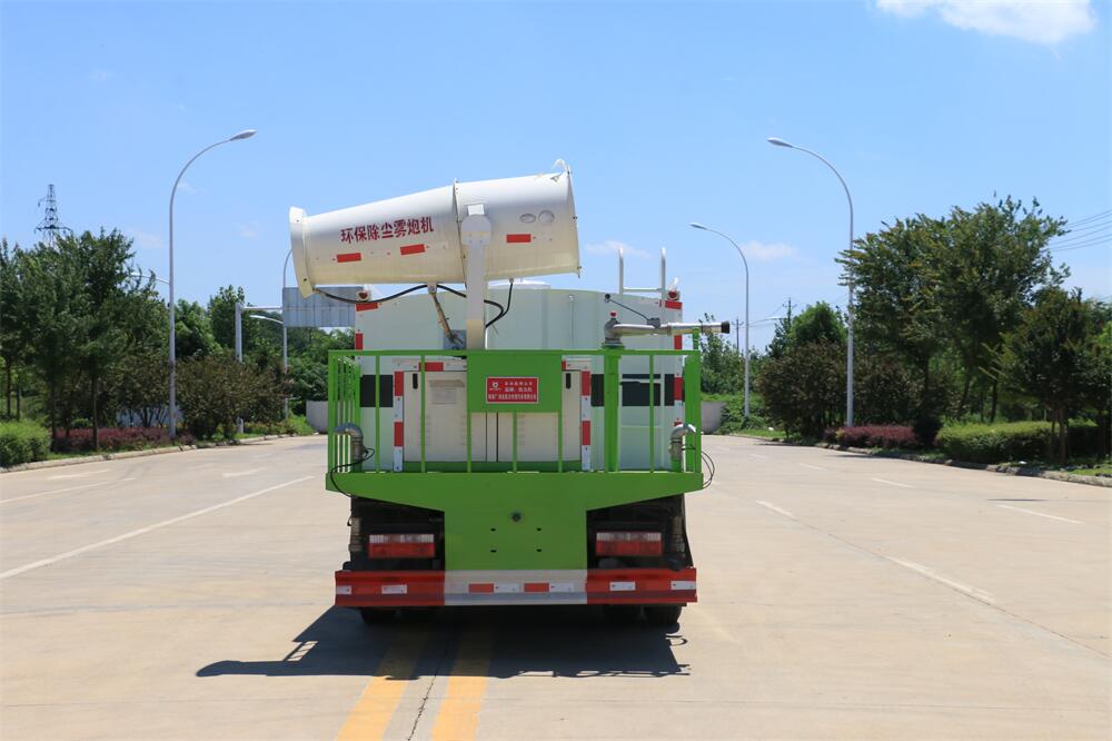 上裝配置:罐體容積為 16立方,選配風(fēng)送式霧炮機組射程30米、40米、50米、60米、80米、100米、120米霧炮,罐體鋼板為4mm碳鋼Q235材質(zhì),罐內(nèi)隔板具有防波作用,以減輕汽車行駛時罐體液體沖擊,罐體及整車外形尺寸按照公告。帶大功率專用灑水泵,泵可自吸自排,整車前沖、后灑、側(cè)噴、帶65消防接口,后平臺配CLW-50、CLW-60、CLW-80、CLW-100、CLW-120型風(fēng)送式霧炮機組;罐體前封頭配大功率柴油發(fā)電機組;前封頭帶水位計,后平臺主管路帶1寸澆花接口,后爬梯。帶兩根輸水管及陰陽端。罐體顏色:銀/灰/綠,罐體兩側(cè)噴“多功能抑塵車”字樣,貼反光標(biāo)示。
