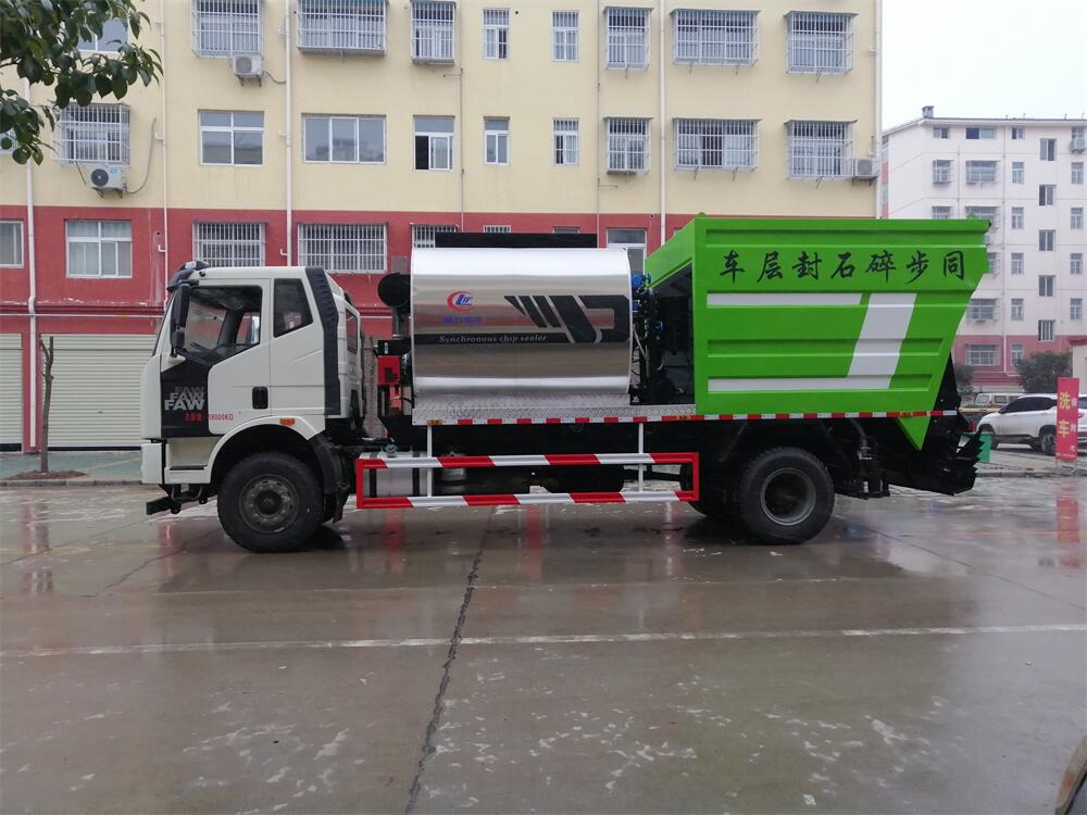 4、后雙橋同步碎石封層車完全采用電氣**,自動化程度高,,能**的計算出設備在施工過程中瀝青噴灑量和石屑撒布量的多少;